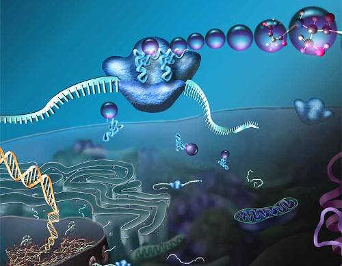 La traduction génétique est un élément essentiel des cellules de tous les organismes. Ayant subi très peu de changements au cours de milliards d’années d’évolution, il a été qualifié d’”accident évolutif figé dans le temps”. Le ribosome (bleu), qui traduit l’information génétique stockée dans les brins d’ARN en protéines, les éléments constitutifs de la vie, est au cœur de ce mécanisme.