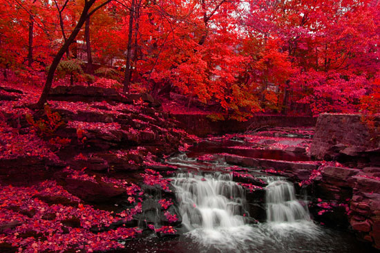 A l’instar du chêne rouge d’Amérique, du sumac ou de l’érable du drapeau canadien, certaines plantes arborent, en plus des tons oranges, de flamboyantes couleurs de feu : elles sont dues aux anthocyanines, une famille de pigments rouges, violets, et bleus qui interviennent aussi dans la maturation des fruits. Contrairement aux carotènes et aux xanthophylles, qui sont toujours présents dans la feuille, ceux-ci sont produits expressément à l’automne, lors de cette période de transition avant la chute des feuilles.