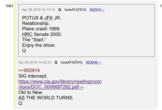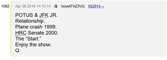 Le 8 avril, QAnon a posté deux messages reliant les Clinton et la CIA à l’accident d’avion de John F. Kennedy Jr et comment sa mort a ouvert la voie à Hillary Clinton pour commencer sa carrière politique en se présentant sans opposition de la part d’un rival démocrate majeur pour le siège nouvellement disponible au Sénat américain pour New York.