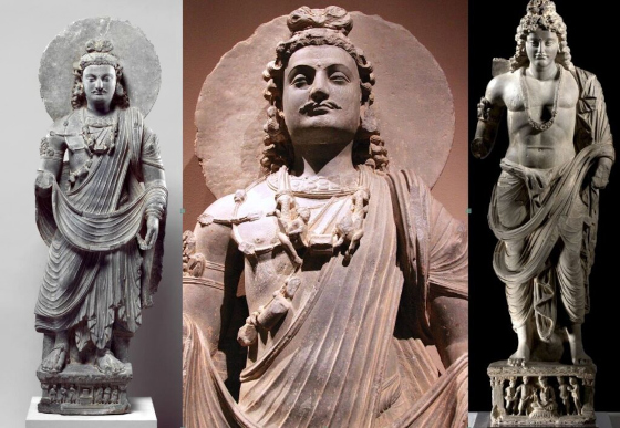 Les artistes du Gandhāra commencèrent à sculpter le Bouddha sous des formes naturalistes et hellénistiques : serein, juvénile, drapé dans les plis d’un himation de philosophe. Jusqu’alors, le Bouddha n’était représenté que par des empreintes de pas, des roues, ou des trônes vides ; soudain il devint visible en tant que theios anēr, un « homme divin » au sens hellénistique – à l’instar d’Héraclès, d’Asclépios ou de Pythagore, qui incarnaient la présence divine sous une forme humaine. Cette transformation ne fut pas un simple emprunt stylistique. Elle exprima la reconnaissance du Bouddha comme maître universel, dont le rôle pouvait être compris à travers toutes les cultures. [Il convient de mentionner que, bien que le Bouddha ait atteint un certain niveau spirituel, donné par l’éveil dans son être de l’enveloppe supramentale, vijnanamaya kosha, il n’a pas atteint la réalisation spirituelle ultime. Cela ressort clairement du fait qu’il n’a pas parlé de l’existence de Dieu, ni de l’Atman, le Soi suprême immortel qui existe dans chaque être humain en tant qu’étincelle du Soi suprême absolu et éternel de Dieu le Père.]a