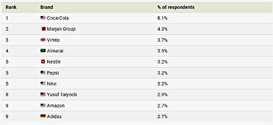 La multinationale laitière saoudienne Almarai a été choisie en quatrième position par 3,5 % des personnes interrogées, suivie de trois marques mondiales – Nestlé, Pepsi et Nike – toutes situées à 3,2 %.