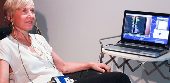 Donc, ce qui se fait classiquement ou traditionnellement, c’est d’aller dans un cabinet physique, ce que, bien sûr, beaucoup de nos entraîneurs utilisent. Ils utilisent ce genre d’installation. Tu y allais et tu t’asseyais sur une chaise confortable. Beaucoup de gens utilisent des fauteuils inclinables. De cette façon, une fois que vous êtes dans la séance, vous pouvez vraiment vous détendre et même fermer les yeux – peu importe si vos yeux sont ouverts ou fermés, à votre choix. Vous écoutez la musique avec des écouteurs ou un casque d’écoute ou les haut-parleurs du système et dans la musique il y aura de petites interruptions. Ces petites interruptions sont en fait l’étape de rétroaction et les interruptions vous aident à vous réorienter vers ce qui se passe actuellement.
