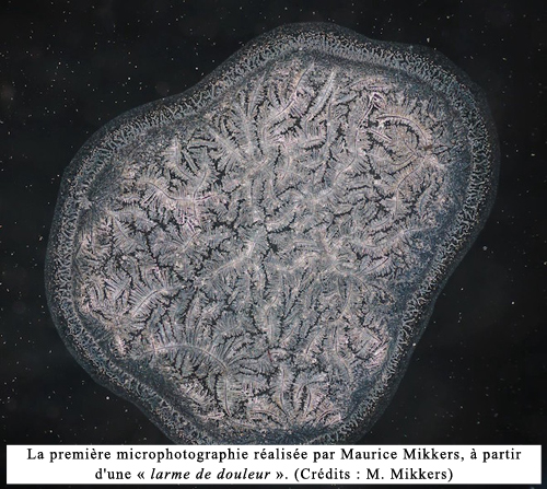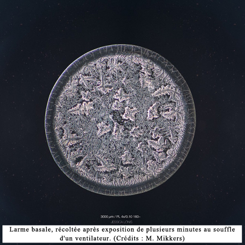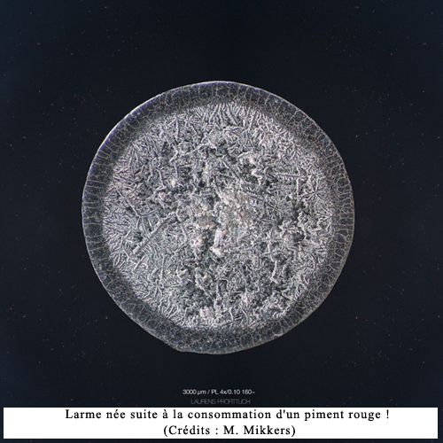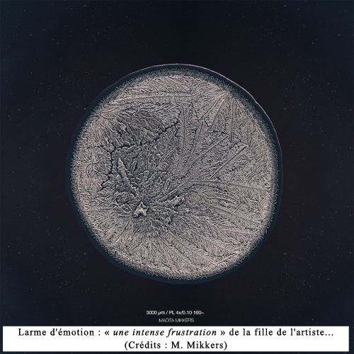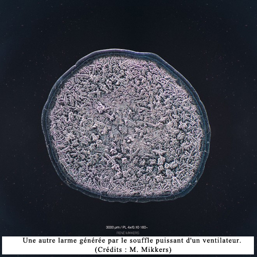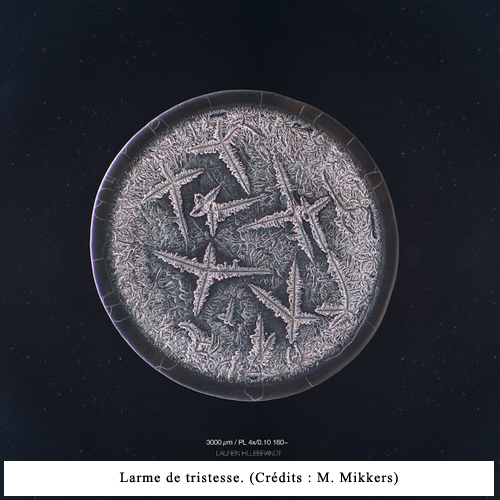 Pour travailler, Mikkers doit tout d’abord vous faire pleurer. Il vous invite à vous souvenir d’un événement particulièrement triste (ou à regarder des extraits de films émouvants), vous laisse croquer dans un piment, ou vous place quelques minutes la tête devant un ventilateur. Il récupère une larme à la pipette, et la verse sur une lame de verre. Puis, il attend que l’eau s’évapore…