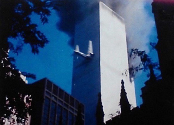 1) Celles diffusées au moment même montrent, sur des images de mauvaise qualité, des silhouettes d’avions à contre-jour, entrant en entier dans les tours sans ralentir. Sur plusieurs vidéos, une silhouette disparaît derrière la tour Sud puis pointe le bout de son nez de l’autre côté (ce que les analystes de ces images ont nommé « le nez de Pinocchio »), comme si l’avion l’avait toute entière traversée sans se déformer : un carreau d’arbalète. Montage bâclé, par incrustation d’images en quasi-direct grâce à un tampon de quelques dizaines de secondes rendant le trucage possible mais hâtif. Aussitôt après cette séquence bizarre, l’image est interrompue pendant une fraction de seconde (un « écran noir »), comme si un technicien, conscient de la bévue, avait voulu la minimiser en interrompant la retransmission.[6]