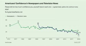 Pourtant, dans le même temps, la croyance dans les versions des grands médias s’est effondrée. Aux États-Unis, l’institut Gallup évalue la confiance dans la presse écrite depuis 1973 et dans la presse audiovisuelle depuis 1993. Celle dans les journaux est passée de 51 à 16 % et celle dans les radios et télévisions est passée de 46 à 11 %.