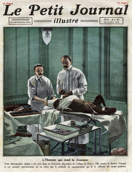 En 1920, Voronov a d’abord transplanté des échantillons de glandes reproductrices de chimpanzés sur un scrotum humain, et le patient a signalé une augmentation de la vigueur, une meilleure mémoire et une endurance accrue. Au cours des années 1920-1930, plus de 500 mâles seulement en France se sont fait transplanter des glandes de singes. Parmi les clients de Voronov figurent l’homme d’affaires Harold McCormick, le président turc Mustafa Atatürk, et le premier ministre français Georges Clemenceau. Surnommé Docteur Jeunesse, Voronov devint rapidement riche, s’entourant de serviteurs et de maîtresses. Ecrivain prolifique, il a popularisé son activité dans de nombreux livres avec des titres comme De Cretin à Génie.