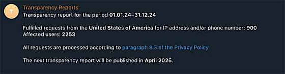 « Entre le 1er janvier et le 30 septembre 2024, Telegram a satisfait 14 demandes ” d’adresses IP et/ou de numéros de téléphone ” en provenance des États-Unis, qui ont affecté un total de 108 utilisateurs, selon le bot Transparency Reports de Telegram. Mais pour l’ensemble de l’année 2024, Telegram a satisfait 900 demandes en provenance des États-Unis, affectant un total de 2 253 utilisateurs, ce qui signifie que le nombre de demandes satisfaites a grimpé en flèche entre octobre et décembre, selon les données nouvellement publiées. »