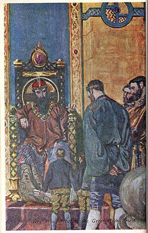 La surprise de mon père et de moi-même fut indescriptible quand, en traversant la majestueuse magnificence d’un hall spacieux, nous avons été finalement conduits devant le très Grand prêtre, régnant sur toute la région. Il était richement vêtu et beaucoup plus grand que ceux qui se trouvaient autour de lui et il ne pouvait pas avoir moins de quatorze (4,26m) ou quinze pieds de haut (4,57m). La pièce immense, dans laquelle nous avons été reçus, semblait être constituée finement de solides blocs d’or abondamment incrustés de bijoux d’une étonnante brillance.