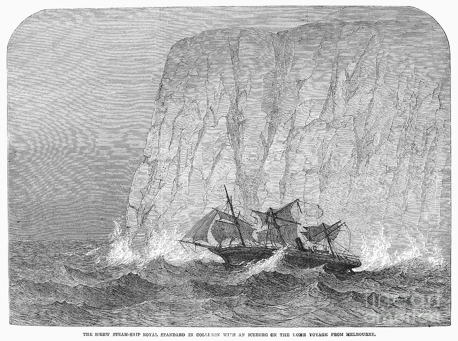 Un jour comme je regardais paresseusement les eaux claires, par-dessus le bord du sloop, mon père a crié : « Ecueil par bloc, droit devant ». En regardant vers l’avant, j’ai aperçu au travers d’une brume qui se dissipait, un objet blanc nous surplombant de plusieurs centaines de pieds haut, coupant complètement notre avance. Nous avons descendu la voile immédiatement et pas assez tôt. Quelques instants après, nous nous sommes trouvés coincés entre deux icebergs monstrueux. Chacun d’eux pressurait et raclait son énorme voisin de glace. Ils ressemblaient à deux Dieux guerriers luttant pour la suprématie. Nous nous sommes alarmés sérieusement. En effet, nous étions en première ligne d’une bataille royale ; le bruit tonitruant du grincement de la glace ressemblait à des tirs continus d’artillerie.