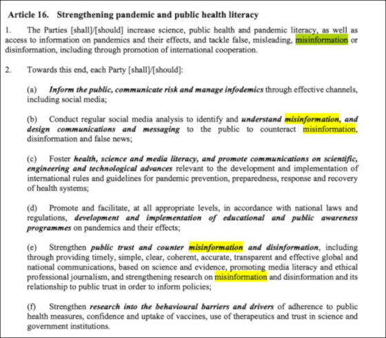 Le projet de traité contient diverses dispositions à l’article 16 (« Renforcement de la pandémie et de la littératie en santé publique ») qui obligent les 194 États membres de l’OMS (qui représentent 98% de tous les pays du monde) à cibler la soi-disant désinformation.