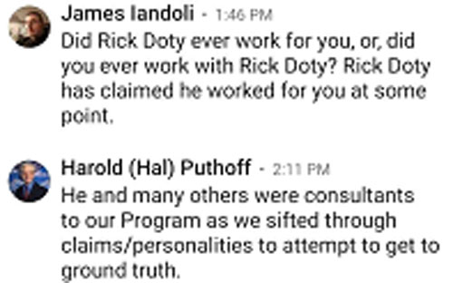Doty a affirmé avoir travaillé avec Puthoff à plusieurs reprises et l’a également mentionné dans l’interview ci-dessous. Je suis tombé sur un tweet du célèbre chercheur sur les OVNIS Grant Cameron, qui a déclaré que Hal Puthoff avait confirmé l’identité de Doty. En outre, un autre chercheur connu et réputé sur les OVNIS, James Iandoli, a également demandé à Puthoff de commenter les affirmations de Doty, et il l’a fait.