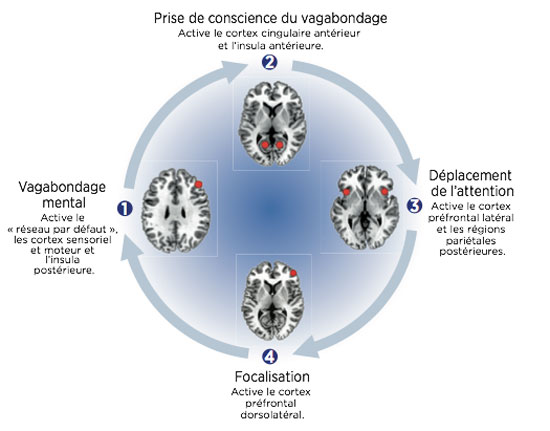Que se passe-t-il sous notre crâne lorsqu’on médite ? Wendy Hasenkamp, neuroscientifique de l’université d’Atlanta (États-Unis) et son équipe ont demandé à des méditants expérimentés de pratiquer pendant vingt minutes allongés dans un scanner et d’appuyer sur un bouton dès qu’ils prenaient conscience que leur esprit s’échappait. Résultat : l’équipe a découvert que le cerveau traversait un cycle de quatre phases, identifiables par l’activation de quatre réseaux neuronaux différents (logiquement) liés à l’attention (voir l’infographie ci-dessous). Ce cycle cognitif se répète maintes fois durant la séance de méditation, modifiant l’état de conscience de l’individu, et finissant par déclencher un sentiment de bien-être.