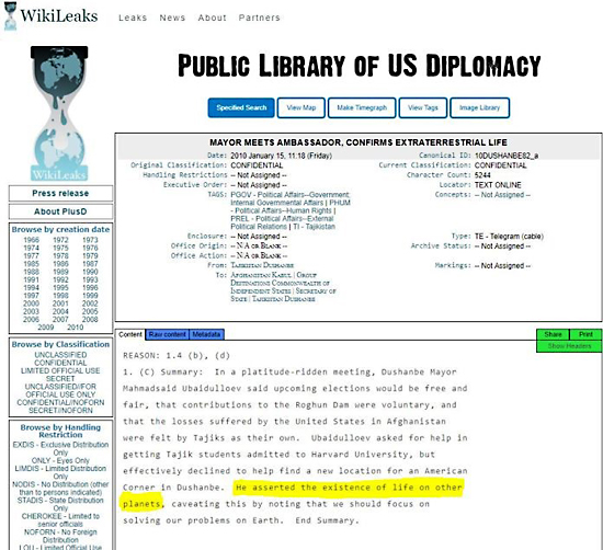 Le site Web lui-même est un trésor d’informations « secrètes », et sans surprise, parmi les 1,2 million de documents publiés sur WikiLeaks, nous en trouvons un qui parle directement de la vie extraterrestre.