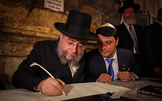 Le rabbin Pinchas Goldschmidt, en train d’écrire un nouveau rouleau de la Torah lors d’un événement auquel ont assisté des rabbins israéliens et européens, en commémoration du 69e anniversaire en date hébraïque, de la libération des juifs d’Europe, dans les tunnels du mur Occidental, dans la Vieille Ville de Jérusalem, le 21 mai 2014.