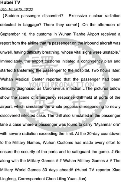 Immédiatement, les douanes de l’aéroport ont initié un plan d’urgence et on transféré le patient à l’hôpital. Deux heures plus tard, le centre médical de Wuhan rapportait que le passager avait été diagnostiqué d’une infection par coronavirus… Les photos montrent la scène de l’exercice d’intervention d’urgence qui s’est déroulée dans l’aéroport, qui simulait tout le processus de réponse au cas infecté nouvellement découvert. […] »