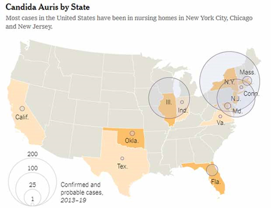 mettait en garde : “ L’unité de soins intensifs est fermée après l’apparition d’une nouvelle superbactérie mortelle au Royaume-Uni. ” (Des recherches ultérieures ont révélé qu’il y a finalement eu 72 cas au total, bien que certains patients n’aient été que porteurs et n’aient pas été infectés par le champignon). » –NYT