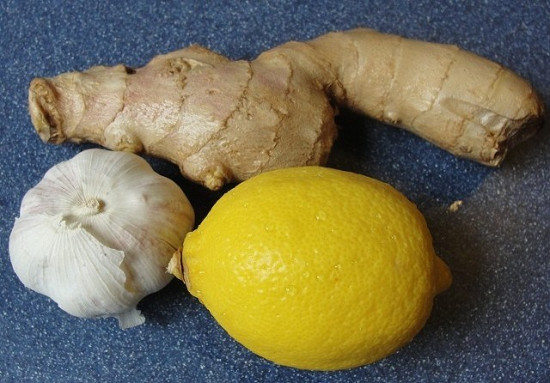-Mettez la racine de gingembre, les tranches de citron et les gousses d’ail pelées dans un mixeur.