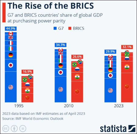 Comme on le sait, le groupe des BRICS est une alliance d’économies émergentes qui aspire à un ordre mondial multipolaire et fait contrepoids au système occidental. Composé à l’origine du Brésil, de la Russie, de l’Inde, de la Chine et de l’Afrique du Sud, le groupe s’est élargi le 1er janvier 2024 et comprend désormais également l’Égypte, l’Éthiopie, l’Iran, les Émirats arabes unis et, depuis 2025, l’Indonésie. Ces pays représentent plus de 45% de la population mondiale et une part significative de la production économique mondiale – et la tendance est à la hausse.