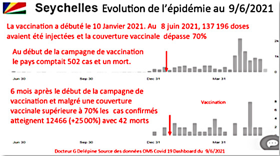 Mais 6 mois après le début de la vaccination, le bilan est passé à 12.466 cas confirmés (+2500 %) et 42 morts, et le nombre de nouvelles contaminations hebdomadaires reste deux fois plus élevé qu’avant vaccination. Et les Seychelles ont depuis la vaccination subi un confinement.