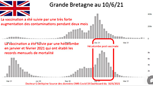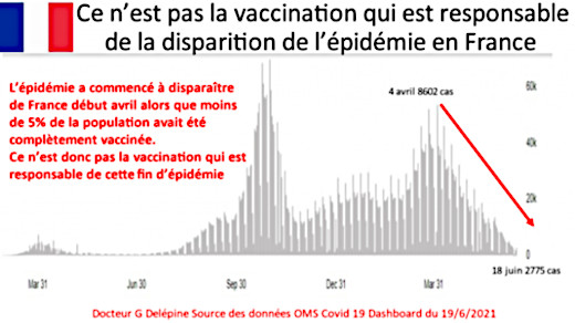 Après cette hécatombe post vaccinale, les responsables de la vaccination et le gouvernement anglais se sont flattés du faible taux de contamination qui a suivi en même temps que l’épidémie régressait également en Europe (-85 % depuis avril 2021) dans les pays vaccinés comme dans les pays très peu vaccinés.