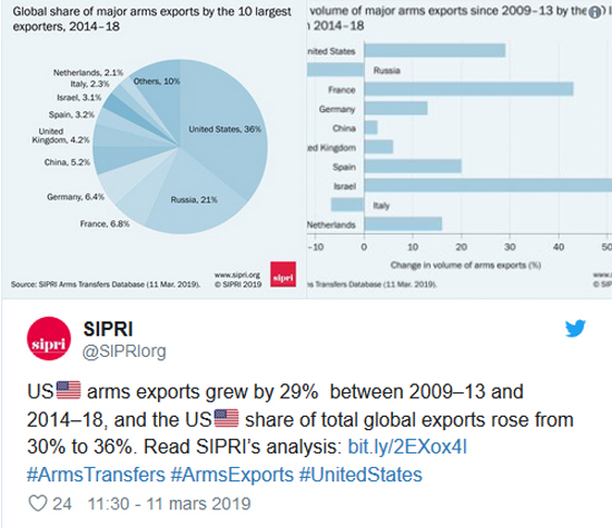 Autre fait notable : « Les Etats-Unis ont davantage renforcé leur position de premier fournisseur d’armes au monde », note Aude Fleurant, directrice du programme Armes et Dépenses militaires du SIPRI. L’oncle Sam a vu ses exportations progresser de 29 % entre 2009-2013 et 2014-2018, et sa part de marché est passée de 30 % à 36 % du total mondial.