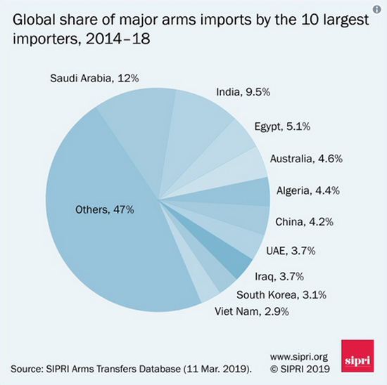 L’Arabie saoudite a conforté sa place de premier acheteur de la planète en triplant ses importations. L’Egypte, numéro 3 derrière l’Inde, a également triplé ses achats pour le plus grand bénéfice de la Russie, de la France et de l’Allemagne. Les importations d’armes d’Israël (+354 %), du Qatar (+225 %), et de l’Irak (+139 %) ont également fortement augmenté entre 2009-2013 et 2014-2018.