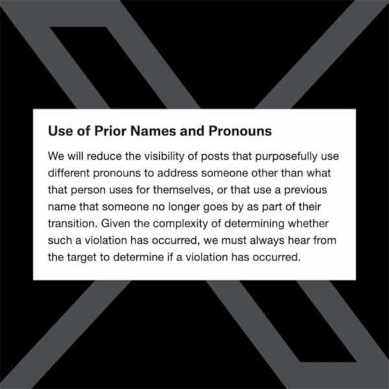 Pour une raison discrète, X a commencé à appliquer des règles révisées, détaillées dans les lignes directrices de sa plateforme pour les utilisateurs – entre autres, en ajoutant une section à la rubrique « Abus et harcèlement » qui concerne l’utilisation des pronoms, et le discours faisant référence aux personnes « en transition » (en termes de transgendérisme).