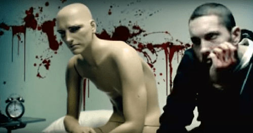 În videoclipurile sale Eminem abordează adesea subiecte legate de sex, droguri și violență (în principal prin alter ego-ul său, Slim Shady), prin inserarea unor secvențe grotești de desen animat. După aproape 20 de ani în industria divertismentului, natura controversată a operelor lui Eminem a luat o întorsătură bizară și obscură.-