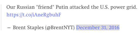 We can now add a second “fake news” fiasco by the Washington Post, alleging without proof that the Russians hacked and manipulated the US electric grid and then retracting a day later. Of course, the damage was already done and the “scoop” went viral. In terms of propaganda that’s a mission accomplished. Again, there is nothing new to see here, if we remember the San Bernardino Shooting in December 2015, the New York Times declared “terrorist ties” to the perpetrators without solid proof, to later acknowledge that a “Systemic Change is Needed After Faulty Times Article”. Again, the effect was already out there, going viral: the US was “under terrorist attack”, or “ISIS is not limited to the Middle East, it can kill you in any American neighborhood”.