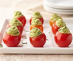 Reţeta este pentru 30 de roşii cherry (de mărimea unei cireşe). Se taie o feliuţă subţire din partea de sus a fiecărei roşii şi cu o linguriţă se goleşte de miez. Întru-un bol se prepară o pastă din avocado copt, cremă de brânză (din care aveţi), sos pesto (sos de busuioc), zeamă de lămâie şi condimente după gust. Se pune compoziţia în roşiile cherry şi se serveşte. Această reţetă delicioasă poate fi preparată şi cu roşii de mărime clasică.
