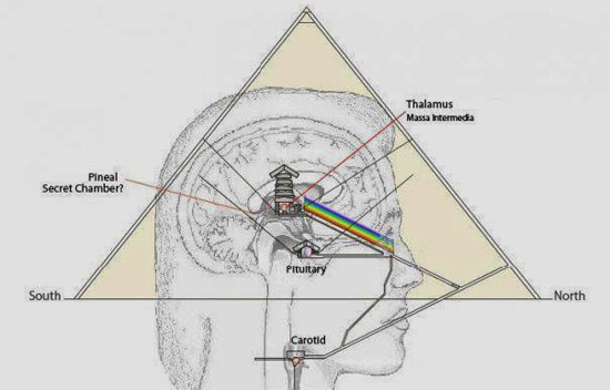 De asemenea, se spune că marea piramidă din Giza a fost construită într-un mod anume pentru a stimula activitatea glandei pineale, iar camera de inițiere a fost construită chiar reproducând forma şi locația acestei glande.