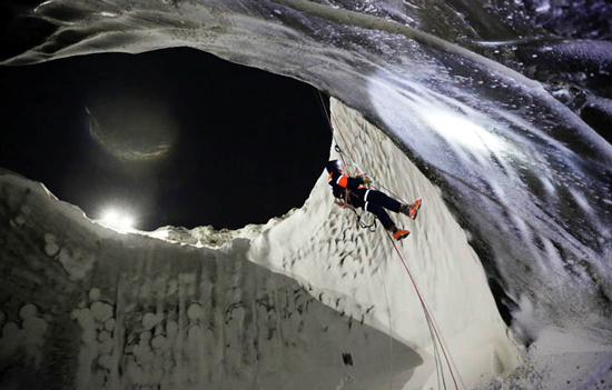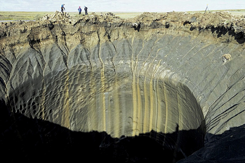 In the photo above, a researcher descends into the depths of a methane blowout crater. “It is believed that permafrost sites could have as much as one million times more methane hydrates locked inside them than ordinary gas”, he said.
