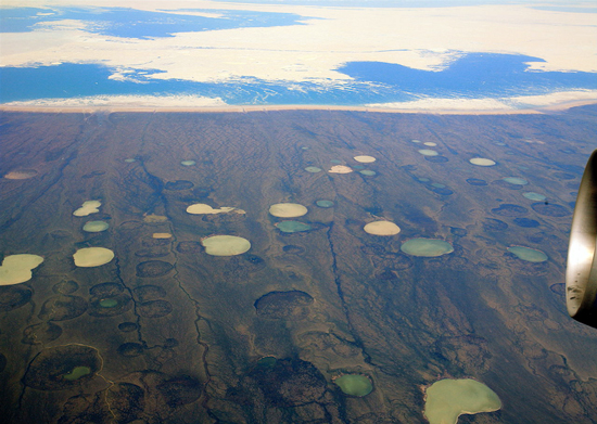 Thermokarst lakes (from rapidly thawing methane deposits) near Hudson Bay, Canada