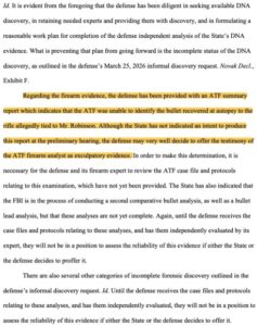 „În ceea ce privește probele referitoare la arma de foc, apărării i-a fost furnizat un raport sumar al ATF care indică faptul că ATF nu a reușit să identifice glonțul recuperat în urma autopsiei ca provenind de la pușca care ar fi legată de domnul Robinson”, au scris avocații lui Robinson într-o cerere de anulare sau amânare a audierii preliminare a clientului lor.