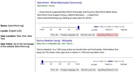The first result is from a white supremacist site. Raters are told it should be flagged as Upsetting-Offensive because many people would find Holocaust denial to be offensive.