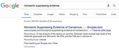 Des annonceurs dont les chiffres d’affaires sont supérieurs au PIB du Portugal. Non, jamais… Quant aux analyses des résidus que le Roundup laisse dans les aliments, et les enquêtes sur le glyphosate dans les aliments en Europe, l’Américain un peu inquiet n’a plus à s’en soucier : le fact checking propulsé par la méta-firme d’indexation planétaire devrait lui suffire. Merci qui ? Merci Alphabet-Google. Et la chasse aux fake news. Les faits, coco, rien que les faits…