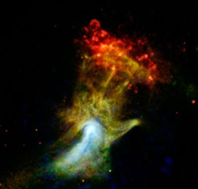 The pulsar is located near the bright white spot in the image but cannot be seen itself, NASA officials said. Scientists aren’t sure whether the ejected material actually assumes the shape of a hand, or whether its interaction with the pulsar’s particles is just making it appear that way.