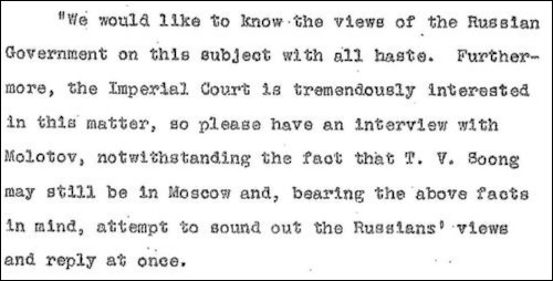 [„Am dori să cunoaștem cât mai repede punctul de vedere al guvernului rus pe această temă. În plus, Curtea Imperială este extrem de interesată de această chestiune, așa că vă rugăm să aveți o întrevedere cu Molotov, chiar dacă este posibil ca T.V. Soong să se afle încă la Moscova și, ținând cont de cele de mai sus, să urmăriți să aflați punctul de vedere al rușilor și să răspundeți imediat.”]