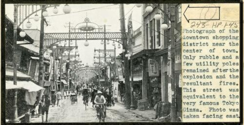 [„Fotografie a cartierului comercial din centrul orașului. În urma exploziei și a incendiilor care au urmat, au rămas doar moloz și câțiva stâlpi de electricitate. Această stradă era echivalentă cu faimoasa Ginza din Tokyo. Fotografia a fost făcută cu fața spre est.”]