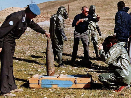 « Au fur et à mesure que les attaques irakiennes se poursuivent et s’intensifient, les chances augmentent de voir les forces iraniennes mettre la main sur un obus au gaz moutarde non explosé et portant des marques de fabrication irakiennes, dit ainsi un rapport top secret de la CIA de novembre 1983. Téhéran présentera de telles preuves devant l’ONU et accusera les Etats-Unis de complicité de violation de lois internationales. »