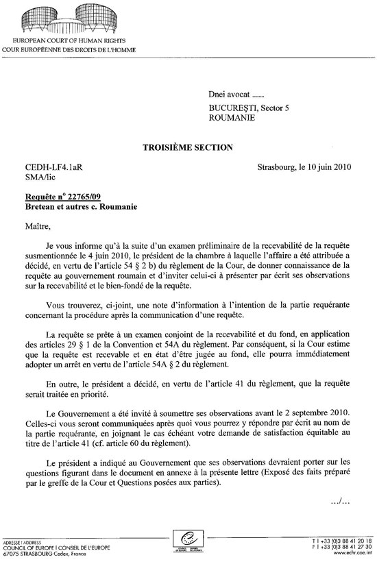 Vă informez că în urma unei examinări preliminare a posibilităţii de admitere a cererii mai sus menţionate, pe 4 iunie 2010, preşedintele secţiei căreia i-a fost transmisă cererea Dvs. (cu aplicarea art. 54, par.2, p. b din Regulamentul Curţii) a decis să înştiinţeze autorităţile române de invitaţia de a prezenta în scris propriile observaţii.
