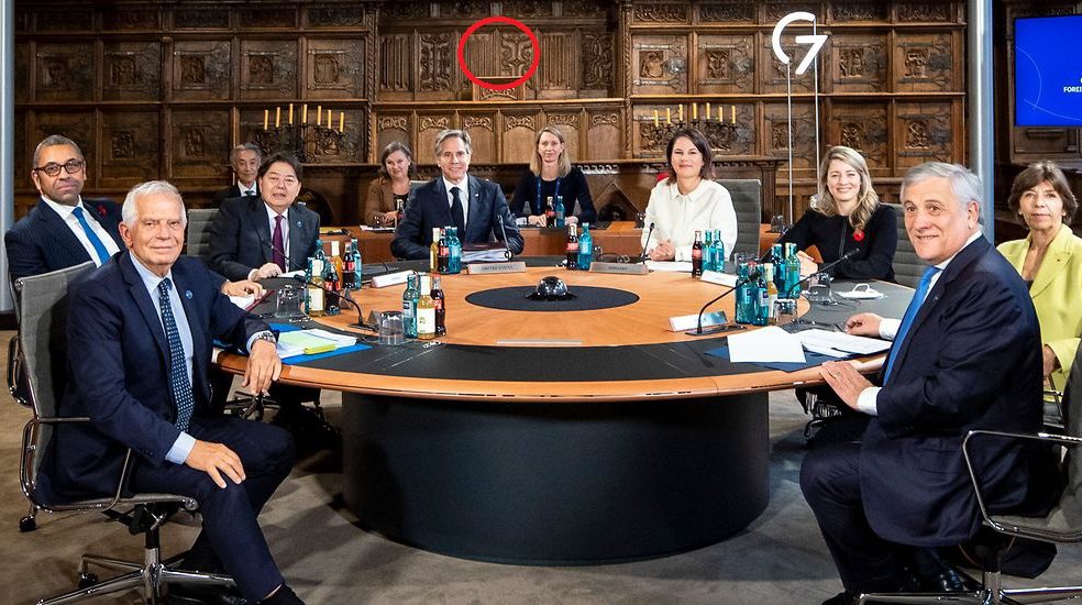 În poza care îi înfățișează pe cei șapte șefi ai diplomațiilor din Germania, Statele Unite, Canada, Marea Britanie, Japonia, Italia și Franța, se observă clar pe peretele de lemn din fundal lipsa lui Iisus Hristos răstignit.