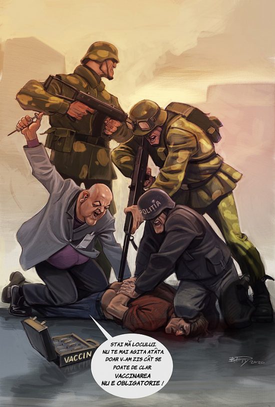 Ilustrație semnată de Willy Petry: Doar v-am zis cât se poate de clar că vaccinarea nu e obligatorie!