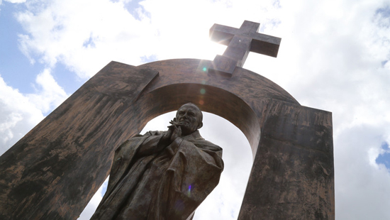 În piaţa care poartă numele papei polonez tronează o statuie donată de artistul rus Zurab Tsereteli, o sculptură care-l reprezintă pe Sfântul Pontif în picioare, cu mâinile împreunate, absorbit în rugăciune. Statuia este acoperită de un arc mare din piatră, deasupra căruia se află o cruce. Se pare însă că simbolul creştinismului, ușor de recunoscut, a deranjat sensibilitățile unor extremişti ai secularismului.