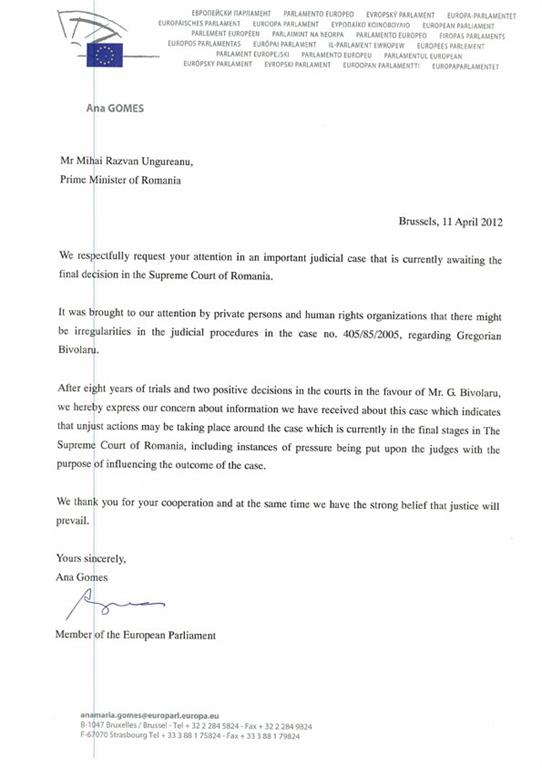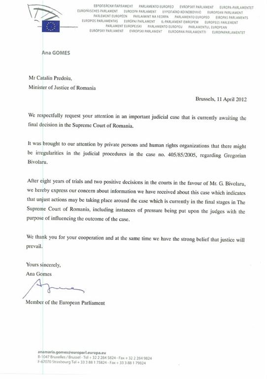 Scrisoarea europarlamentarei Ana Gomes adresată primului ministru al României şi ministrului român de justiţie – 12 aprilie 2012