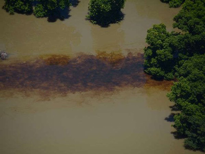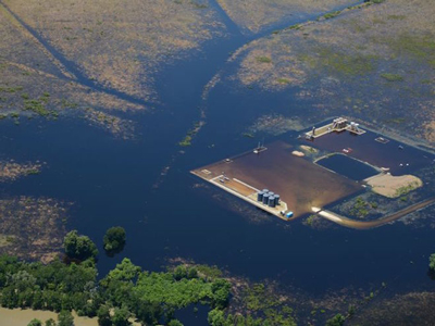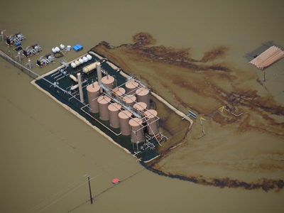 În fotografiile zonelor afectate se pot vedea pete de petrol precum şi dâre care curg de la tancurile înclinate şi de la locurile de fracturare care au fost inundate în timpul revărsării râului Sabine, în martie 2016.