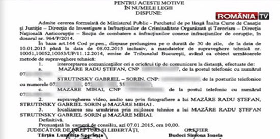 Potrivit documentelor prezentate de România TV, afaceristul Sorin Strutinsky, dar şi fostul edil al Constanţei, Radu Mazăre, au fost interceptaţi încă de când se aflau în libertate, existând pe numele lor două mandate de „interceptare a comunicaţiilor ori a oricărui tip de comunicare la distanţă”, „supravegherea video, audio sau fotografiere” şi „localizare sau urmărire prin mijloace tehnice”.