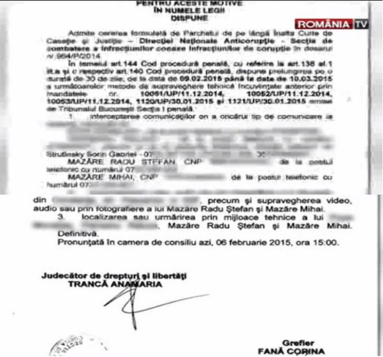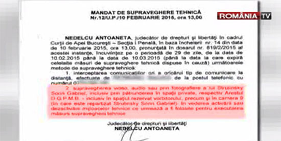 În cele din urmă, cea care a permis Direcţiei Naţionale Anticorupţie să aibă acces la discuţiile private ale inculpatului Sorin Strutinsky cu orice persoană îl vizita la vorbitor, inclusiv avocatul său, precum şi să intre în celula nr. 9 unde mai erau cazate şi alte persoane care nu se aflau sub supraveghere (dar cu toate acestea erau ascultate), şi deci în intimitatea unei persoane, a fost judecătoarea Antoaneta Nedelcu de la Curtea de Apel Bucureşti, care a emis mandatul de supraveghere tehnică nr. 12/IJ.P/10 februarie 2015 (facsimil 3).