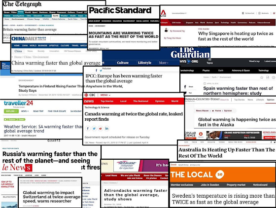 Mijloacele de informare în masă publică constant articole despre faptul că avem o gravă problemă cu încălzirea globală, și în funcție de țara unde apar asemenea articole, avem și diferite țări care experimentează această încălzire mai rapidă decât media planetei, de obicei dublă. Sunt articole în toate limbile, scrise în diferite stiluri, pentru a corespunde gusturilor unor ținte diferite din public. Uneori comparația nu se face cu media încălzirii întregii planete, ci doar cu media încălzirii din țara respectivă. De pildă, site-ul american High Country News scria că „Parcurile Naționale se încălzesc de două ori mai repede decât teritoriul total al SUA”. O frumoasă pildă de articol calibrat pentru publicul care iubește natura și drumețiile prin parcuri naționale!