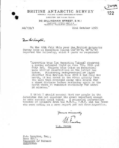 „Pe data de 12 iulie a acestui an, British Survey Base of Antarctic on Deception Island (62° 59’ S, Long 60° 34’ W) a raportat următoarele, pe care le citez după cum ați cerut: «Cei de la baza argentiniană de pe Insula Deception au observat o lumină colorată în mișcare în zilele de 7 iunie, 20 iunie și 3 iulie. De asemenea și colegii chilieni au făcut observații similare în ultimele două date specificate anterior. Lumina se mișca aparent haotic pe cer, cu o viteză uriașă, pentru circa 20 de minute după care dispărea la fel cum și apărea, fără niciun zgomot.» Cu stimă, V.E. Fuchs”.